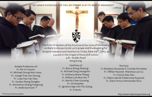 The Friars Preachers of the Province of Our Lady of the Rosary cordially invite you to join us in prayer and thanksgiving for Simple Professsion and Vestition on Friday June 29th, 2012, at 5:30 pm in the Chapel of Rosaryhill School.