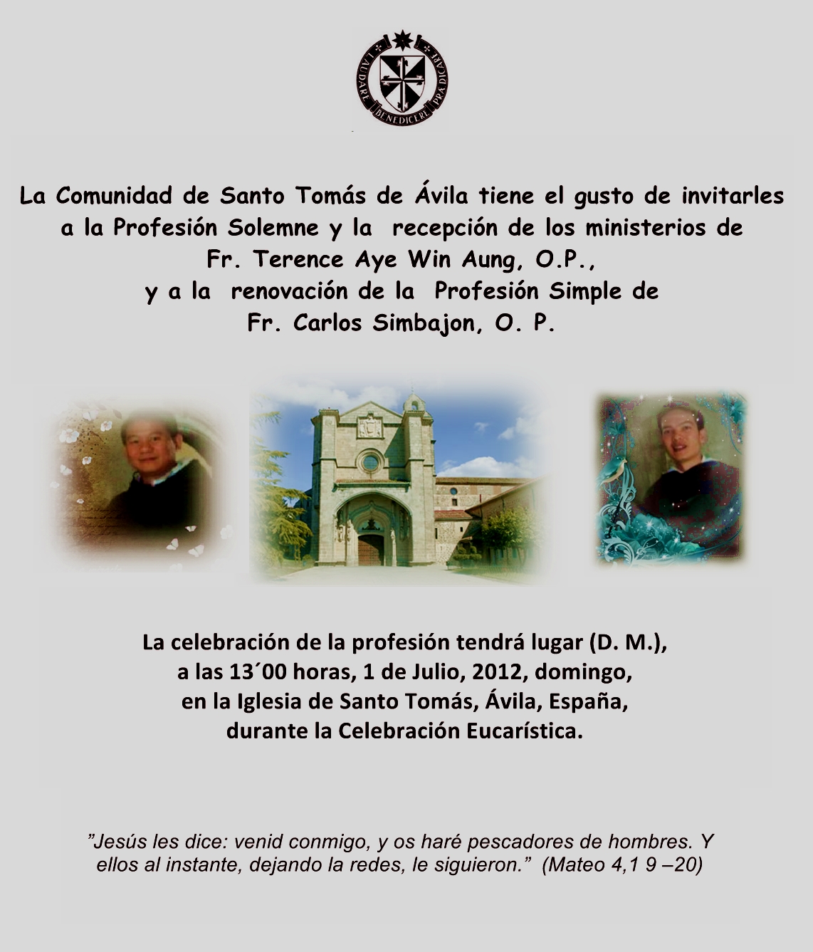 The Invitation of  the Solemn Profession and Reception of Ministries of Brother Terence, OP. and the Renewal of the Simple Profession of Brother Carlos,OP.  These events will take place in our Convent of  Santo Tomas in Avila on July 1, 2012.